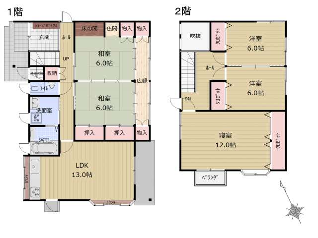 | 詳細間取 | 5LDK (2階:洋12帖×1、2階:洋6帖×2、1階:和6帖×2、1階:LDK13帖) | ||