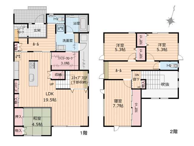 | 詳細間取 | 4SLDK (2階:洋7.7帖×1、2階:和5.3帖×1、2階:洋5.3帖×1、1階:和4.5帖×1、1階:LDK19.5帖、サービスルーム3帖) | ||