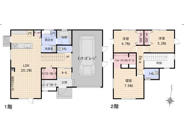 | 詳細間取 | 3LDK (2階:洋7.5帖×1、2階:洋5.2帖×1、2階:洋4.7帖×1、1階:LDK20.1帖) | ||