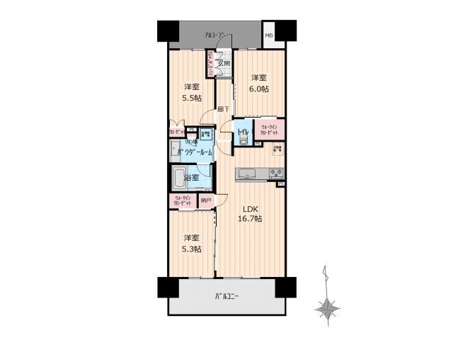 | 詳細間取 | 3LDK (洋6帖×1、洋5.5帖×1、洋5.3帖×1、LDK16.7帖) | ||